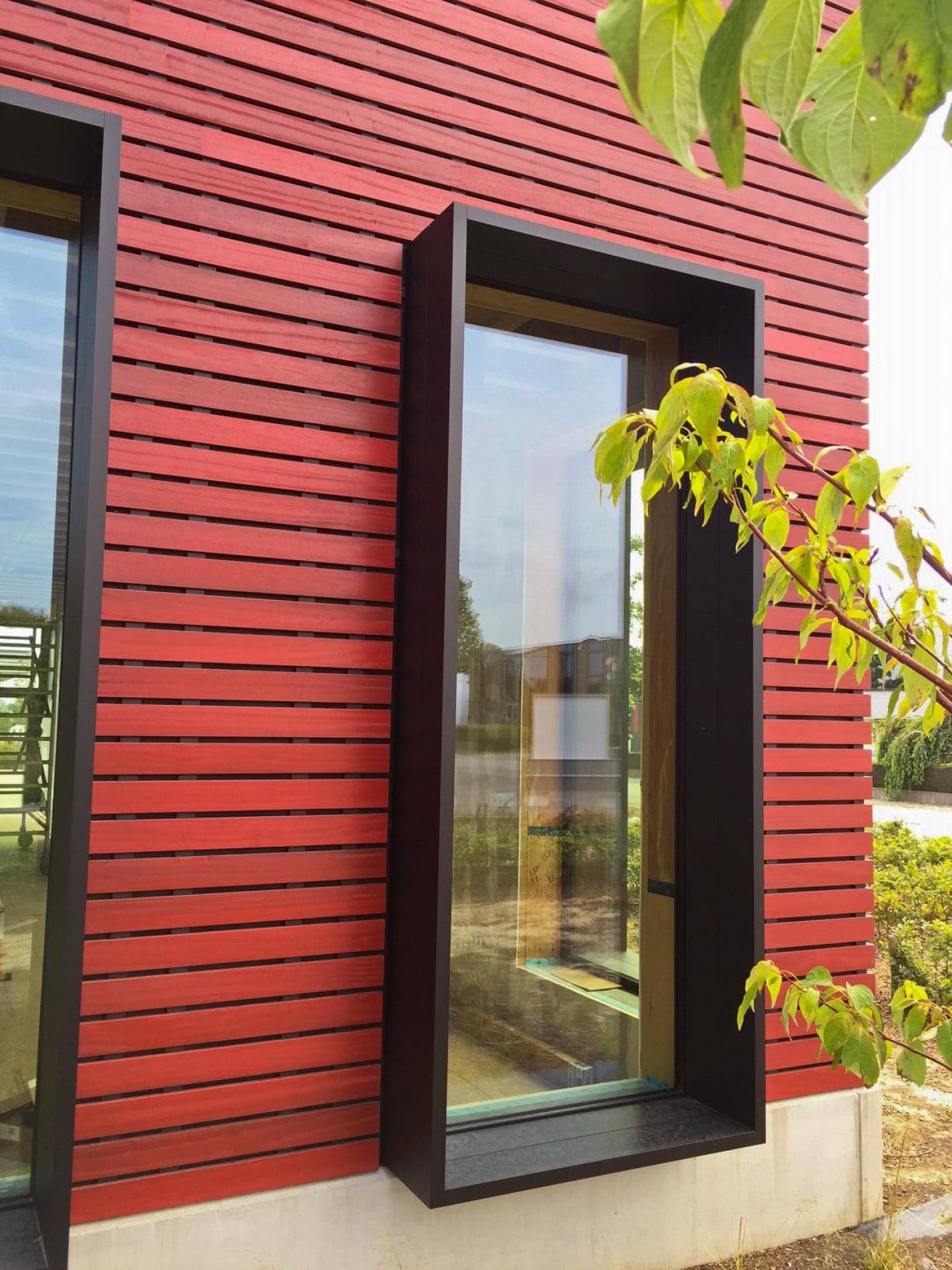 Le bâtiment Omniwood se distingue par une architecture moderne sublimée par un bardage Vedety en Padouk teinté rouge, installé avec le système Techniclic à fixation invisible. Ce revêtement bois haut de gamme incarne l’alliance parfaite entre esthétisme, durabilité et performance technique. Avec ses lames de 60 mm, ce bardage en Padouk offre une finition soignée, homogène et contemporaine, parfaitement adaptée aux projets architecturaux d’envergure.