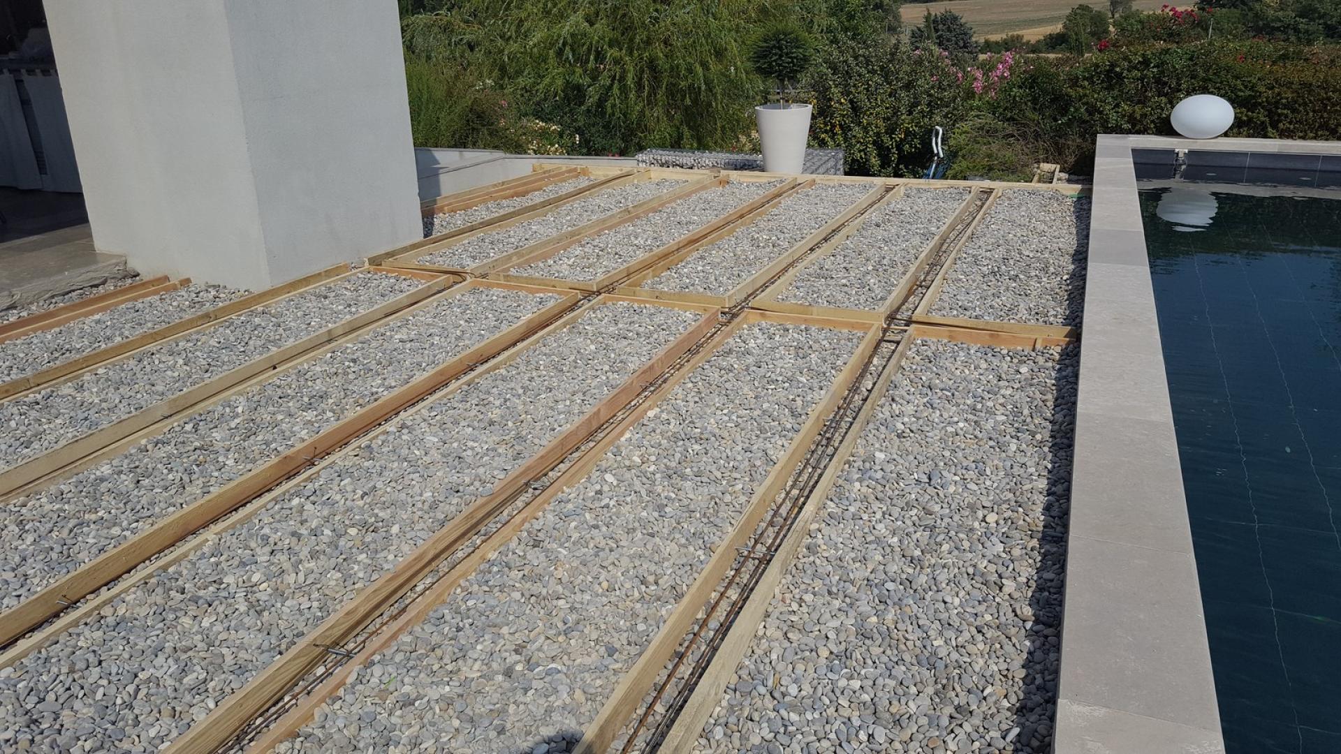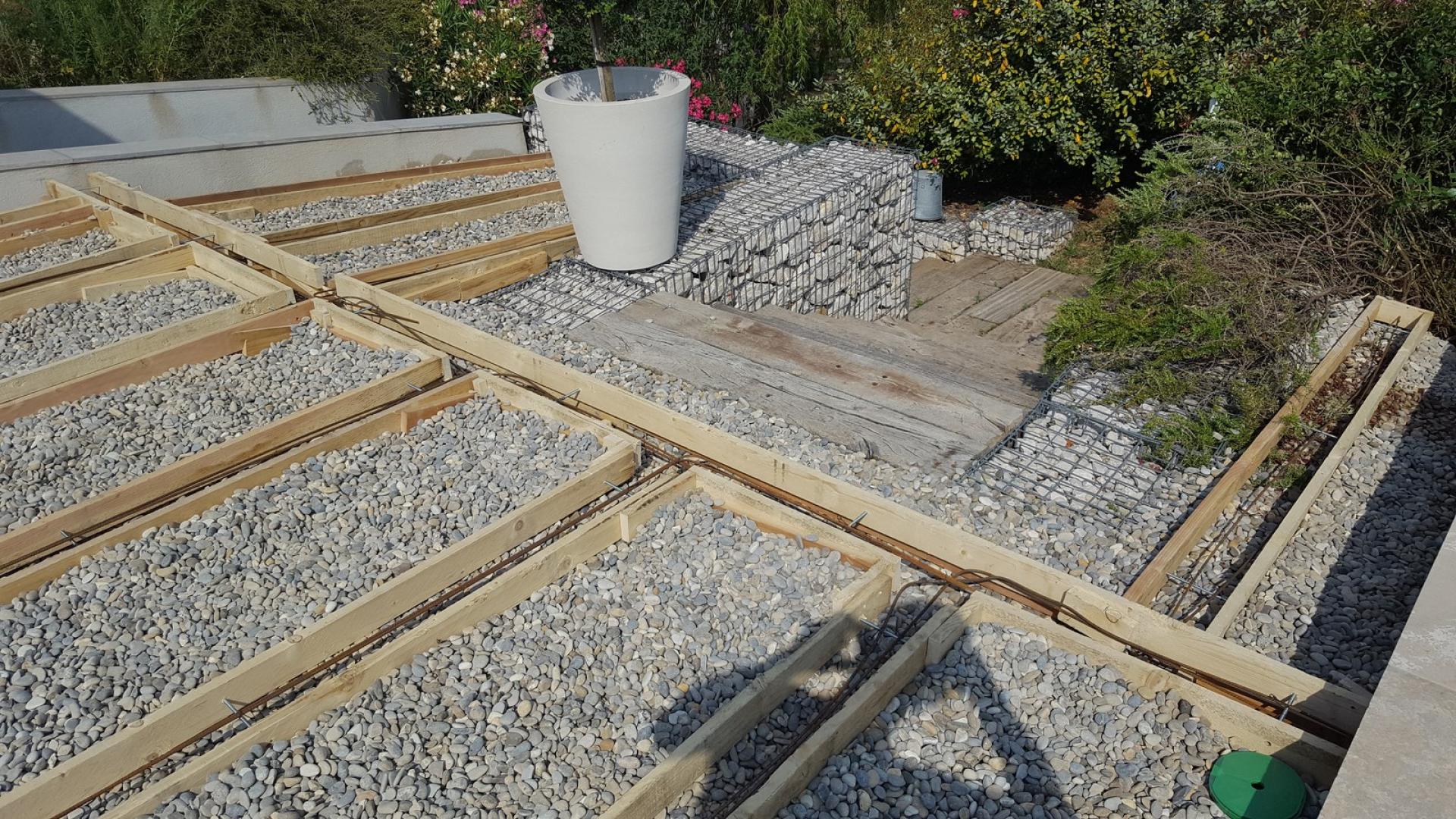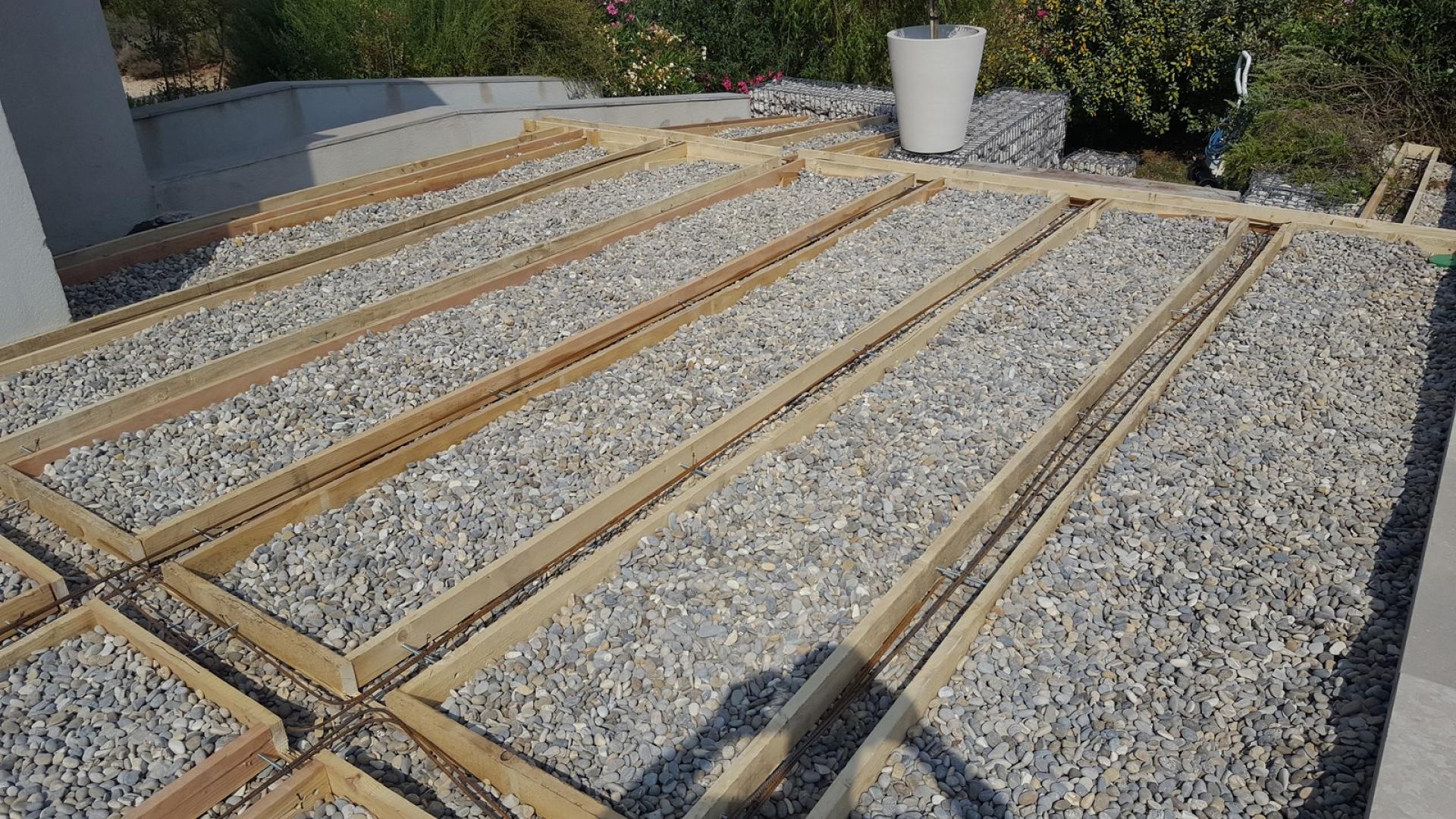 La terrasse est fixée avec des vis apparentes sur des longrines en béton armé, créées spécifiquement pour ce projet. Les longrines en béton armé servent de fondation solide et durable, assurant la stabilité de la structure. De plus, les lambourdes en padouk assurent une uniformité dans le design et une résistance accrue contre les éléments.