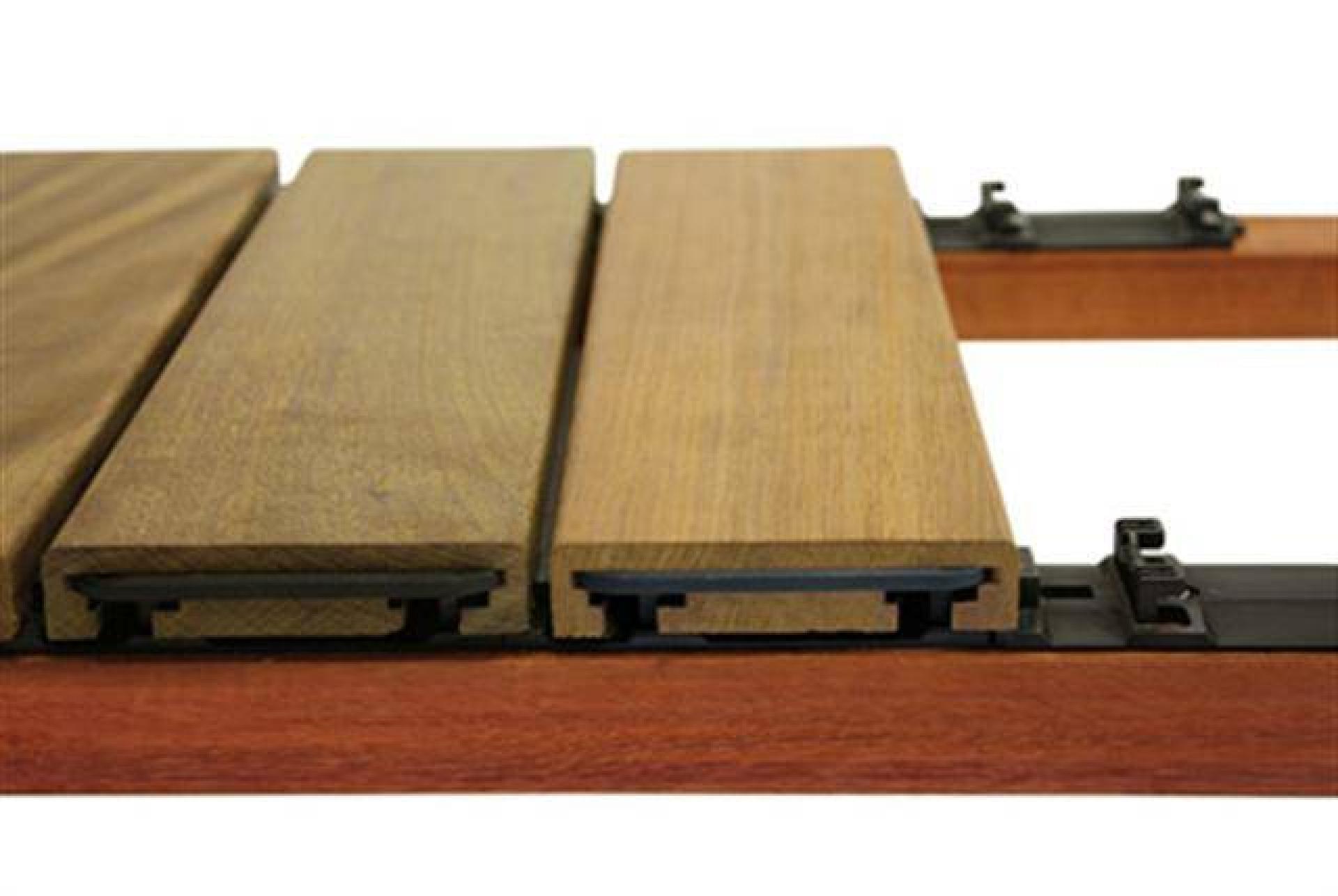 Padouk, Merbau, Ipé, Teck, Cumaru, Blondo | Épaisseur : 20 mm (24 mm avec clips inclus), Largeur : 100 mm (96 mm pour le teck), Longueurs : 800 - 1200 - 1600 - 2000 - 2400 - 2800 mm, vendu en panachage de longueurs, Profil : S4S, E2E, R2.5 mm, rainuré Softline®, Face visible : lisse, 1er choix, Jonction des lames : rainures et languettes Softline® en composite montées d’usine |
