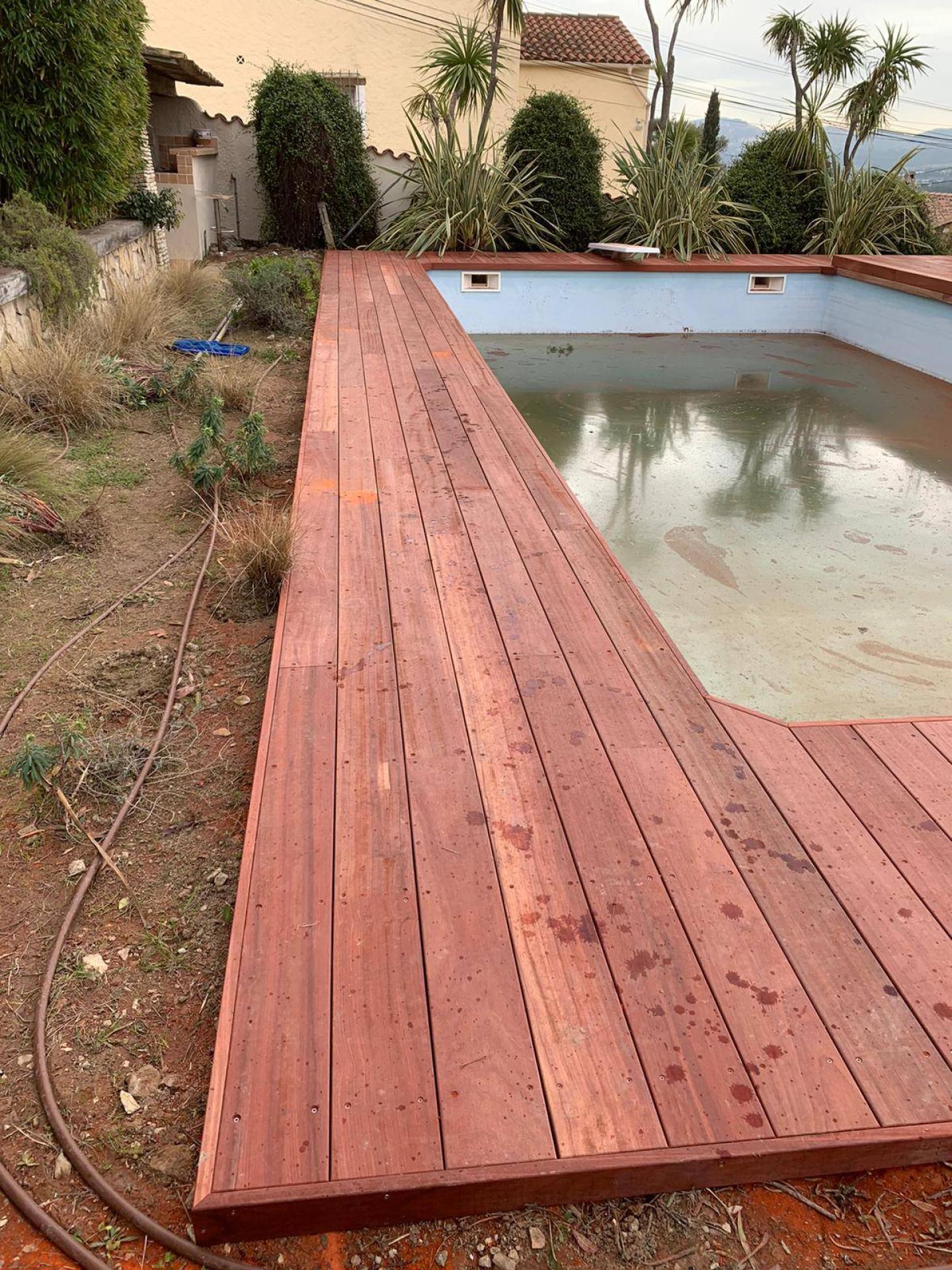 La Parqueterie Aixoise, maître dans l'art de la parqueterie haut de gamme, vous présente la magnifique terrasse en bois de Padouk située à Ceyreste. Cette essence de bois exotique est reconnue pour sa résistance et sa couleur caractéristique, qui en fait le choix idéal pour une terrasse de qualité supérieure.