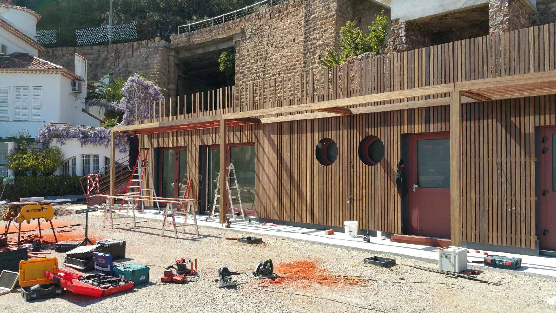 Lors de l’habillage de la nouvelle base nautique de Théoule sur Mer, nous avons opté pour la pose d'un bardage en Padouk, un bois exotique d'une rare beauté et d'une robustesse exceptionnelle. Le Padouk, natif d'Afrique, est reconnu pour sa durabilité et sa capacité à résister aux éléments, ce qui le rend particulièrement adapté aux constructions situées près de la mer.