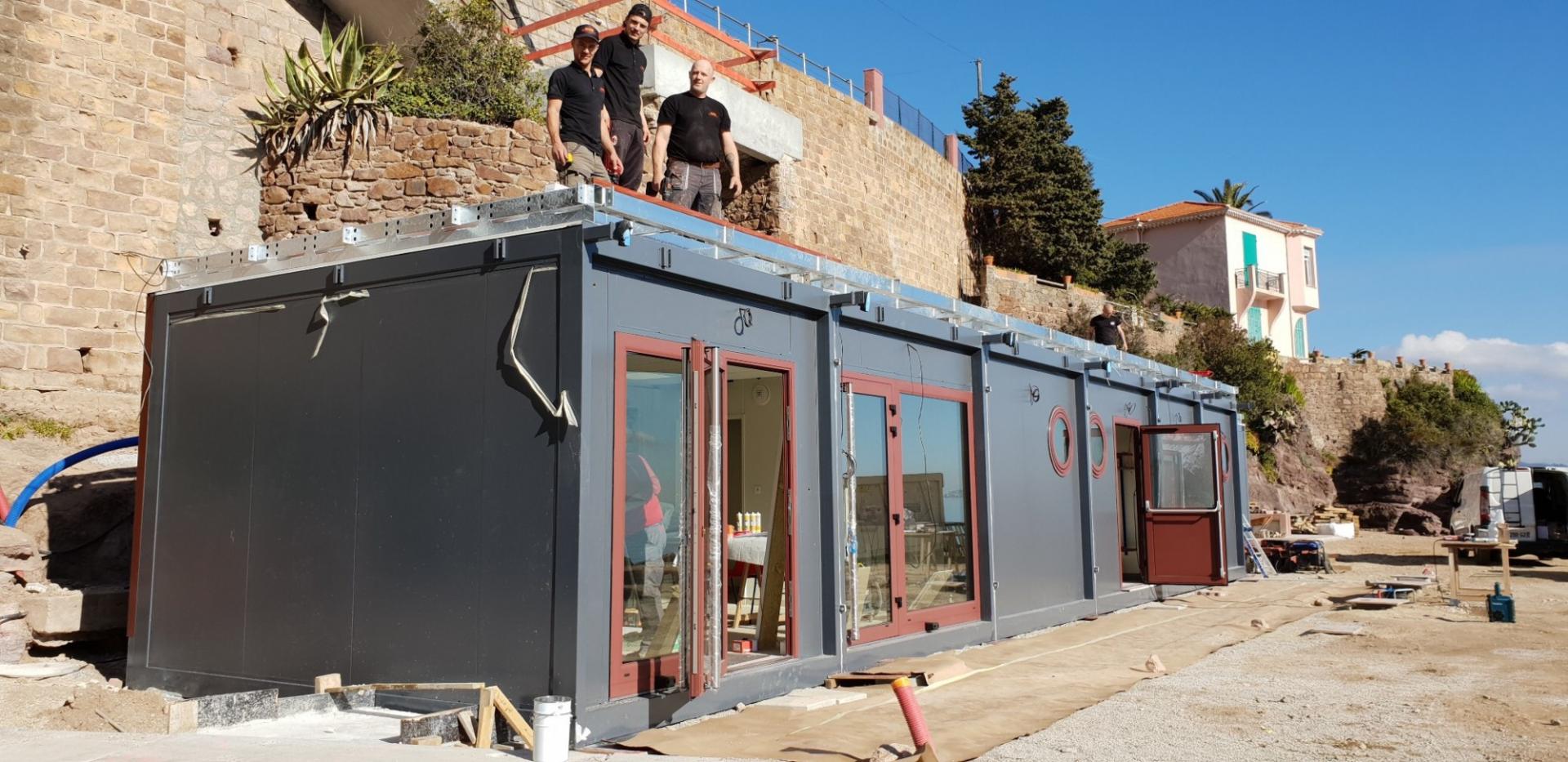 Pour ce projet spécifique à Théoule sur Mer, nous avons réalisé un bardage en Padouk à claire-voie ainsi qu'un toit terrasse dans la même essence. Cette technique permet non seulement une aération naturelle du bâtiment mais aussi une intégration douce et naturelle dans le paysage maritime environnant.
