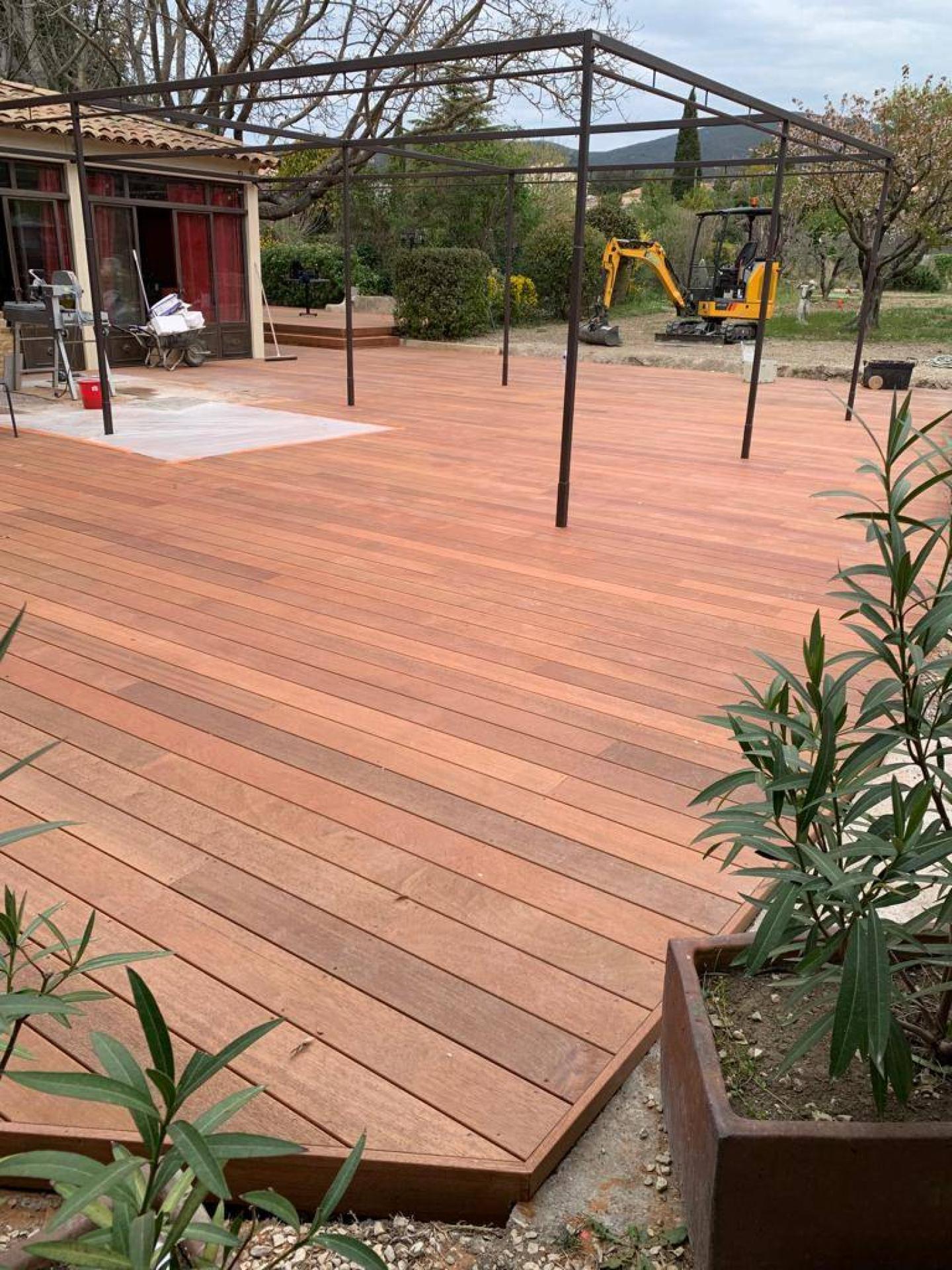 Notre dernier projet d'envergure à Lourmarin est à présenter avec fierté : une magnifique terrasse de 200m2 en Merbau, un bois exotique réputé pour sa solidité et son élégance naturelle. Cette accomplissement témoigne de notre dévouement envers la qualité et l'excellence.