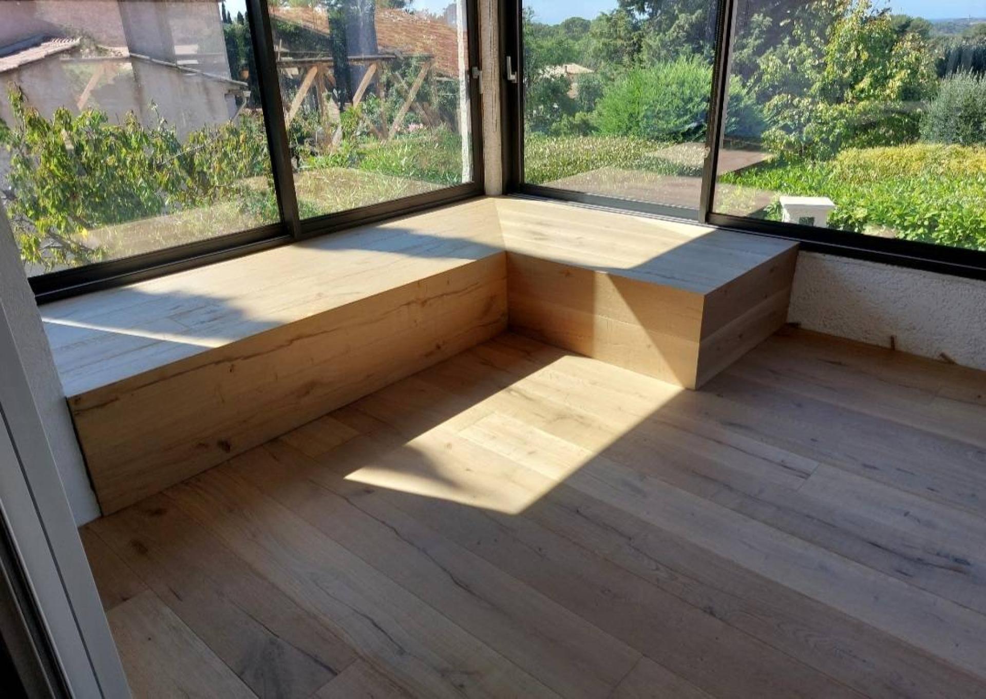 La Parqueterie Aixoise est ravie de vous présenter l'une de ses récentes créations, où l'élégance intemporelle se marie avec le confort contemporain. Grâce à l'utilisation du parquet "Carcassonne" de notre partenaire de confiance, Lamett, nous avons métamorphosé une véranda en un espace de vie lum...